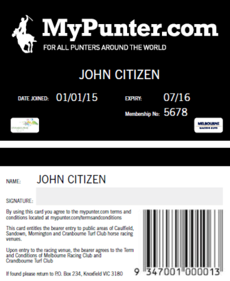 MYPUNTER CARD.- GRANTS ACCESS TO ALL MEMBERS TO CAULFIELD, SANDOWN, MORNINGTON, CRANBOURNE & ALICE SPRINGS RACING CLUBS ENTRY BY SHOWING YOUR CARD.